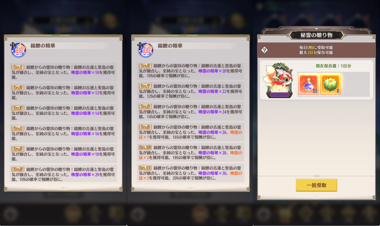 1.秘霊の贈り物とは、一部の秘霊スキルの効果により、每日0時に与えられる報酬のことです。