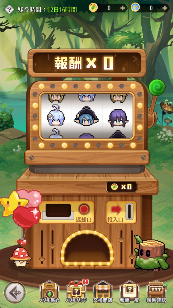 5.「報酬一覧」にある「???」は、左·中·右の絵柄が揃わない場合を指します。この場合は獲得可能な報酬は「新芽メダル×20」となります。