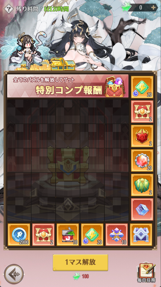 毎日任務をクリアすることで「パズルの欠片」と様々なレアアイテムを獲得できます。