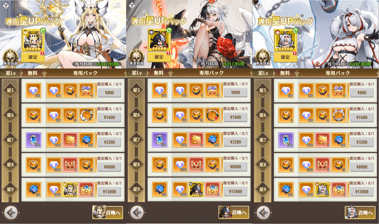 イベント期間中、指定三勇者のどれかを選択し、その勇者に星UPさせ、星Lv条件を満たすと報酬を受け取り、対応する星Lvのパックの購入資格を獲得できます。