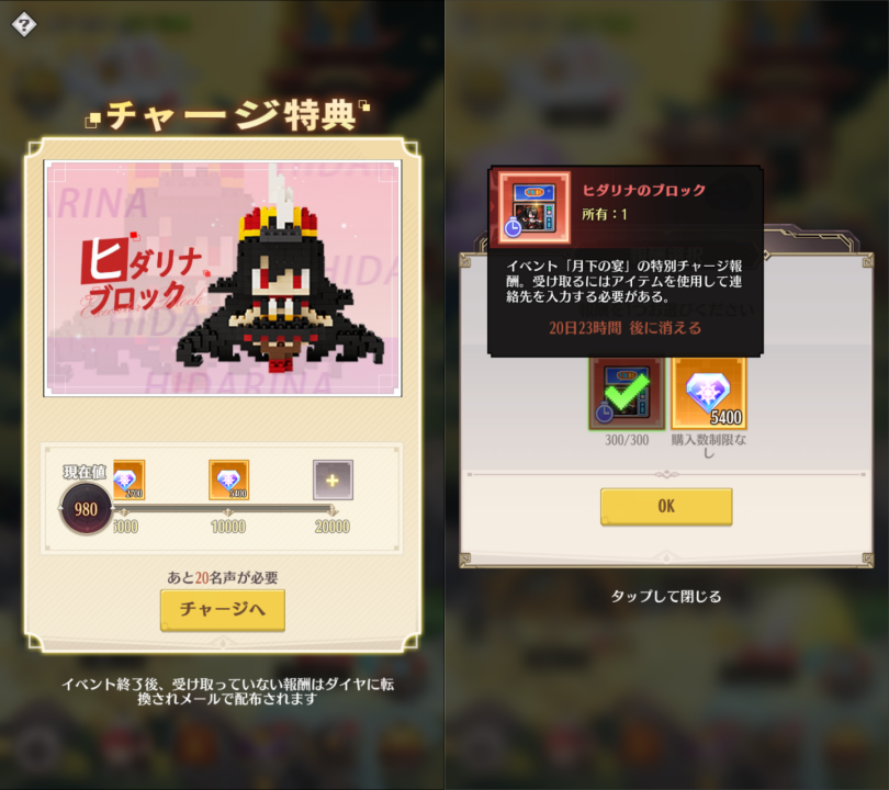 1、イベント期間中にチャージで獲得した累計名声に応じて、チャージ特典が受け取れます。目玉特典として、「ヒダリナのブロック」を用意しております。
