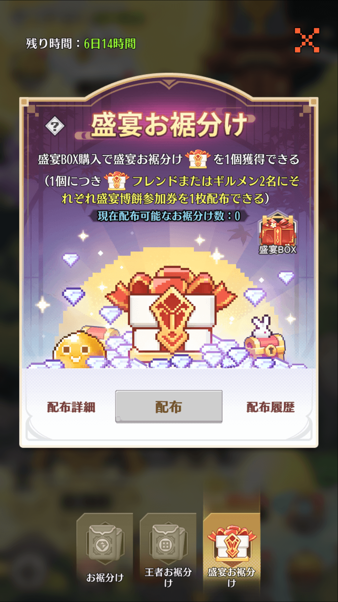 ③盛宴BOX購入で盛宴お裾分けを1個獲得できる(1個につきフレンドまたはギルメン2名にそれぞれ盛宴博餅参加券を1枚配布できる)