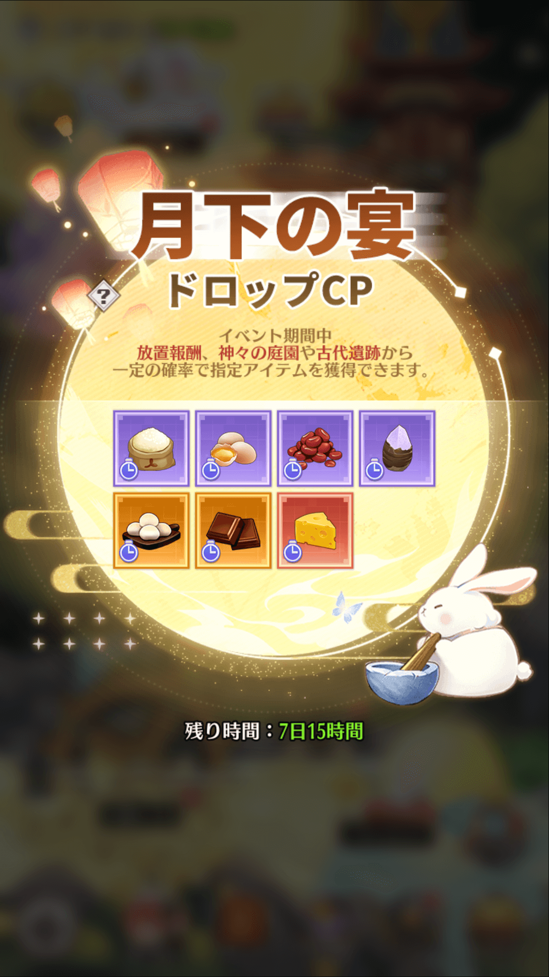イベント期間中、放置報酬、神々の庭園や古代遺跡から一定の確率で指定アイテムを獲得できます。