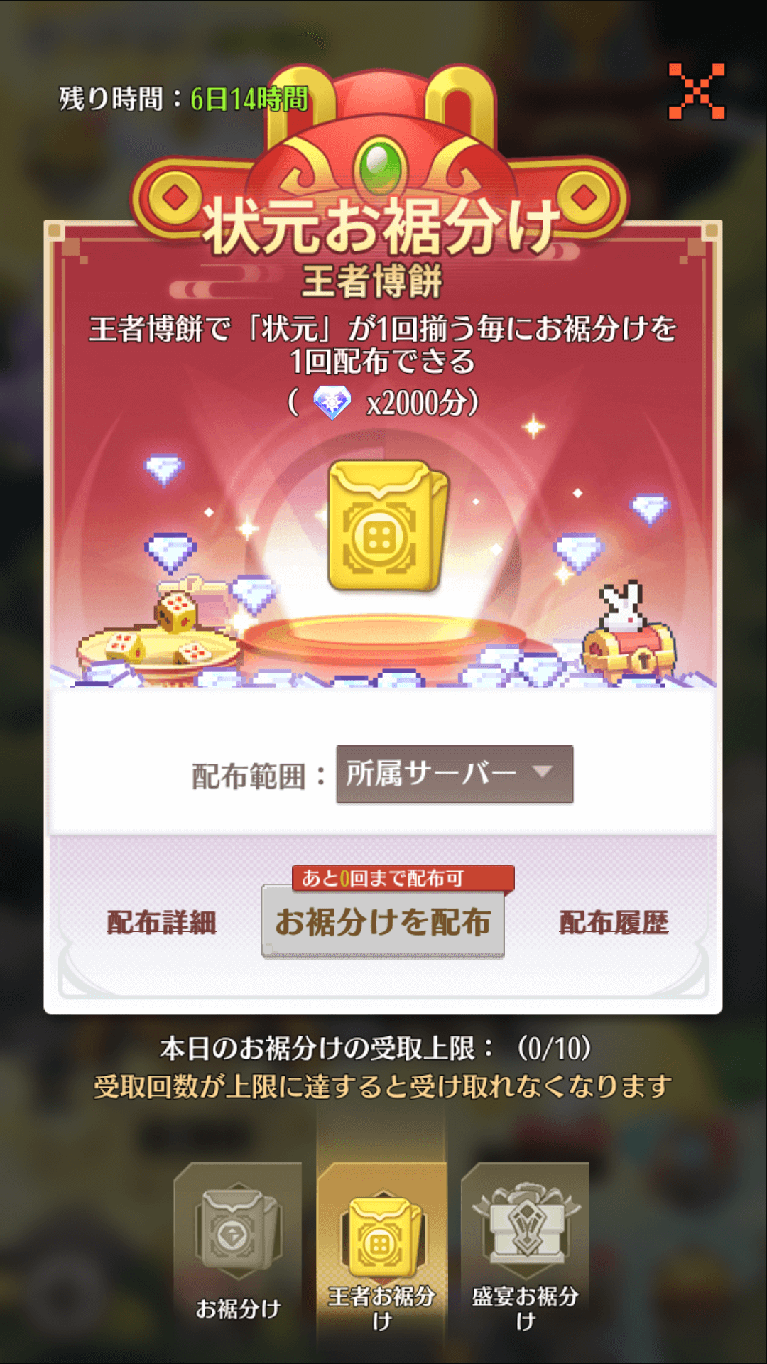 ②王者博餅で「状元」が1回揃う毎にお裾分けを1回配布できる(ダイヤx2000分)