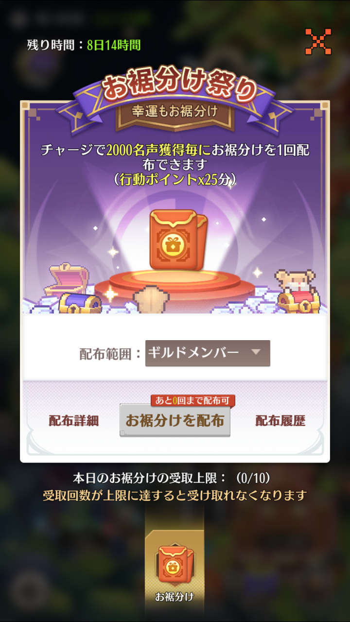 ①チャージで2000名声獲得ごとにお裾分けを1回配布できます(歓楽博餅参加券x25分)