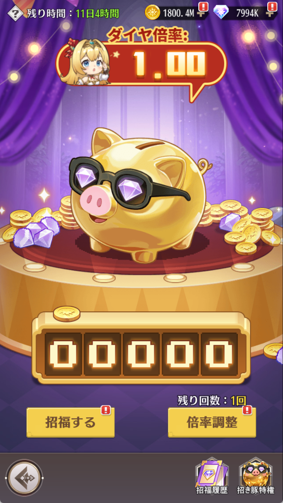3.招き豚特権購入後、ダイヤ倍率は固定的に5倍になります。
