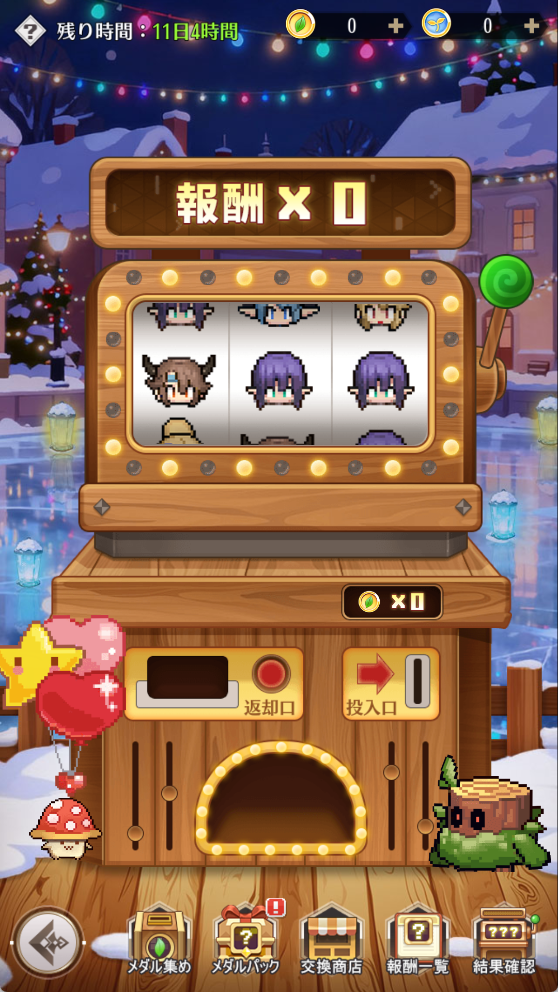 5.「報酬一覧」にある「???」は、左·中·右の絵柄が揄わない場合を指します。この場合は獲得可能な報酬は「新芽メダル×20」となります。