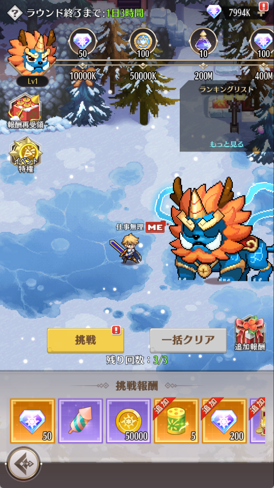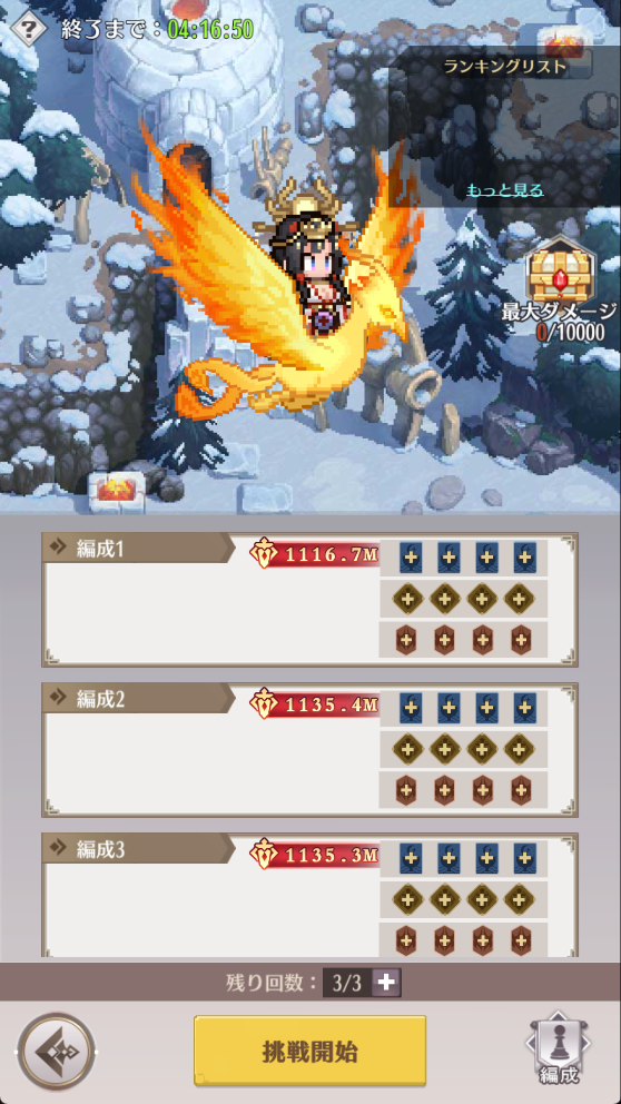 2.ランキングは3日に1回集計されます。毎回の挑戦や周回でボスに与えた総ダメージが高いほど、順位が高いです。ラウンド終了の15分前は集計時間に入り、その間は挑戦できません。集計終了後、報酬が配布され、ランキングがリセットされます。