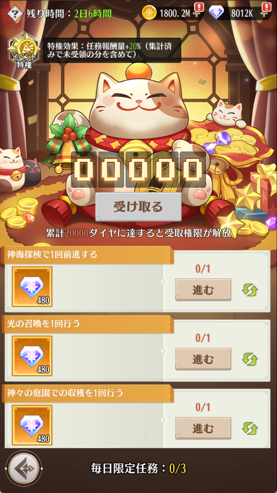 1.招き猫任務を每日最大3個達成できます。任務達成後のダイヤは集計されます。累計ダイヤ数が20000に達すると報酬の受取権限が解放されます(イベント期間中に開設された新サーバーの達成条件はある程度に緩くなり、12000まで下げることが可能です)。