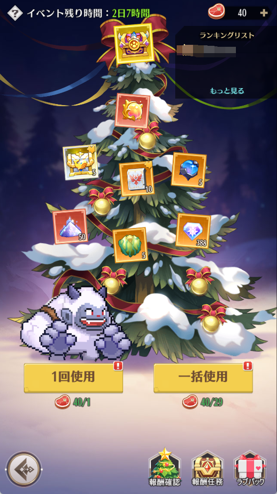 1.「熟成肉」を使用してギフトッリーを揺らすことで報酬を獲得できます。設定された範囲の報酬をすべて獲得すると、報酬範囲は変更しなくなります。