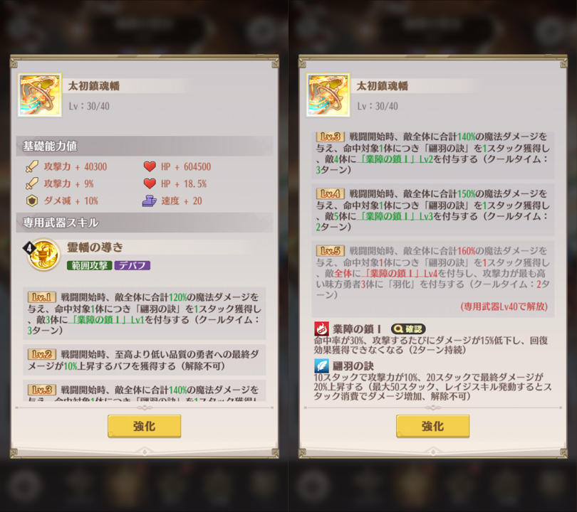 3、専用武器のLv上限は30です、指定Lvまでアップすると専用武器のスキル効果を強化できます。