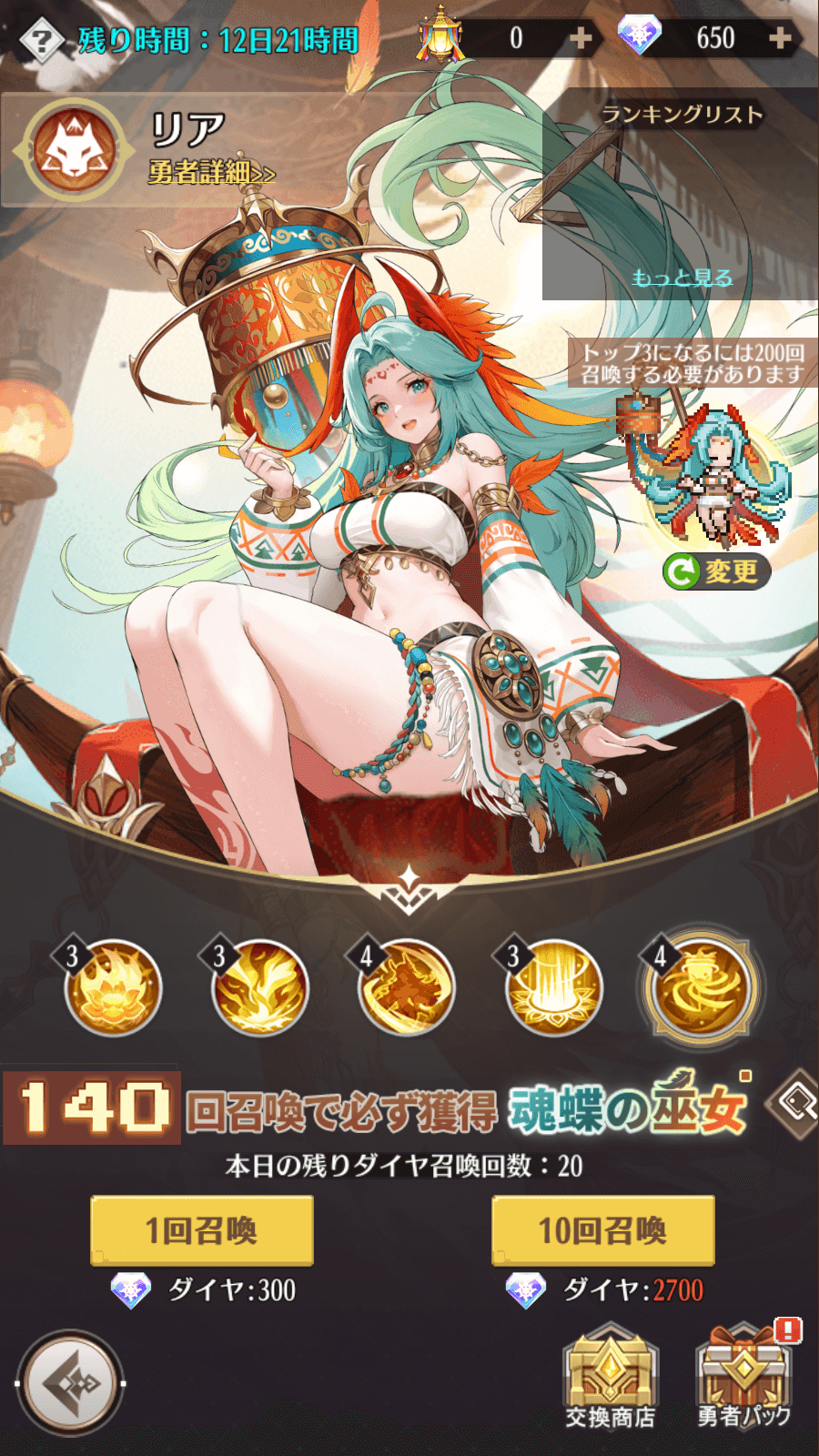 4、「魂蝶の巫女・リア」からの専属至高召喚では特殊な召喚アイテムが使用され、イベント終了後、アイテムは1:270の割合でダイヤに転換されます。