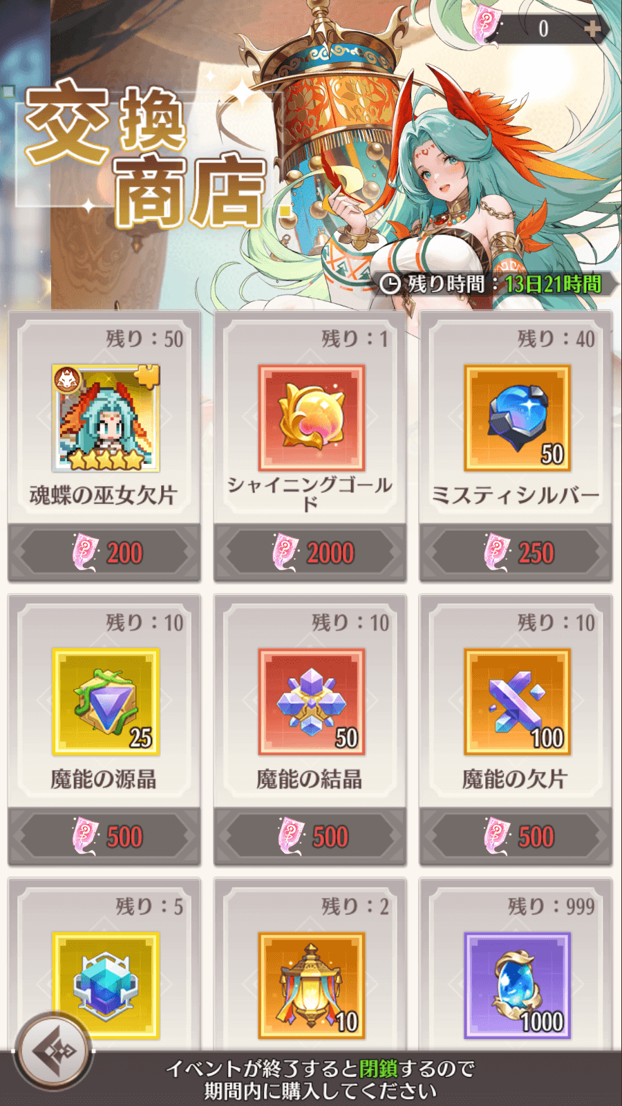 1、期間限定専属至高召喚で「魂蝶の巫女・リア」を召喚できます。召喚を行うと必ずイベント交換商店の通貨を獲得できます。イベント交換商店の通貨で「魂蝶の巫女・リア」の欠片、「魂蝶の巫女・リア」の専用武器の素材などを交換できます。イベント交換商店の通貨はイベント終了後に消えます。