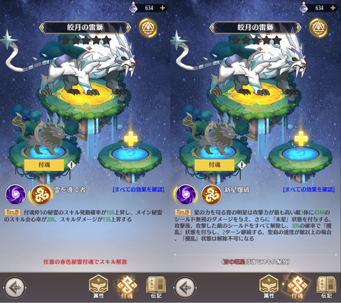 3、金色秘霊の中では「宵の明星」のみが「皎月の雷獅」に付魂可能で、赤色秘霊はどれでも「皎月の雷獅」に付魂できます。