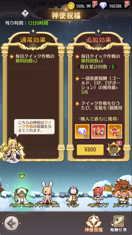 1.神使祝福は各コンテンツに増益効果を与える特権で、主に6種類あります。特権効果は通常効果(無料)と追加効果(有料)に分けられます。