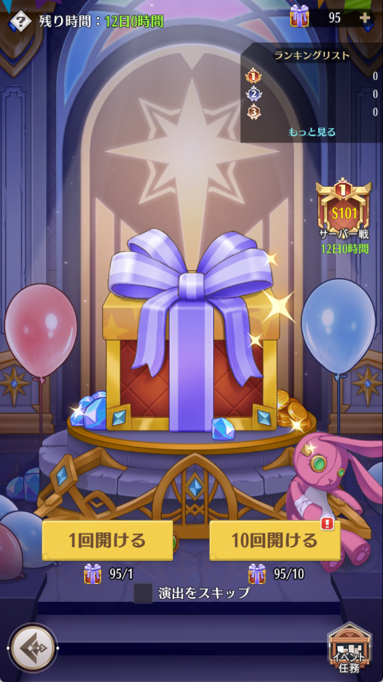 4.ギフトボックスを開けた回数に応じてランキング設置されています。回数が多いほど、順位が高いですが、同じ場合は先に達成した方が順位が高いです。また、ランキング報酬はイベント終了後にメールにて配布されます。
